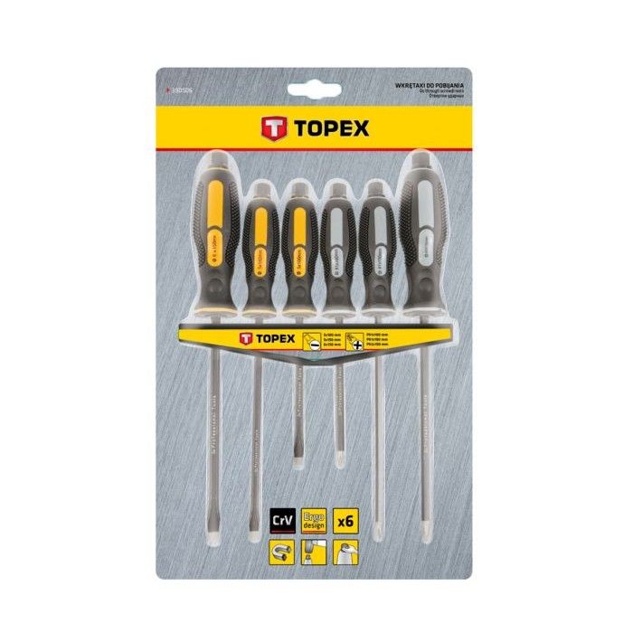 Набор ударных отверток Topex (6 шт.) - незаменимый инструмент для любого мастера или любителя в домашних условиях. Отличное сочетание качества и доступной цены делает этот набор очень популярным среди покупателей. Он состоит из 6 штук отверток с различными насадками, которые позволяют удобно и быстро выполнять работы с креплениями разного типа. Благодаря специальному покрытию, отвертки обеспечивают надежное сцепление с креплением и предотвращают его повреждение. Ручки удобно лежат в руке, не скользят и не утомляют во время использования. Приобретя этот набор, вы получите необходимые инструменты для проведения ремонтных работ или сборки мебели.