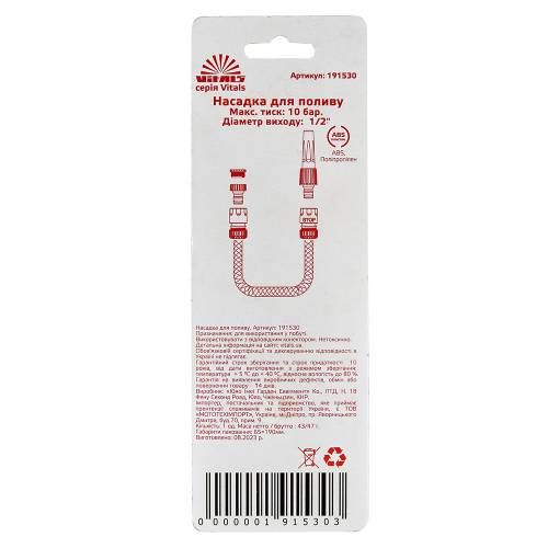 Дополнительные уникальные свойства и преимущества насадки для полива с плавным регулированием потока воды для коннектора 1/2" Vitals: - Возможность установить нужный уровень увлажнения - Долговечность - Легкость в использовании - Небольшие размеры и легкий вес - Экономия воды