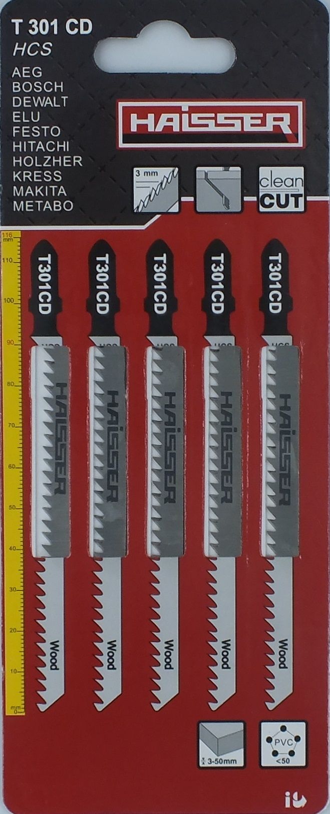 Пилочное полотно HAISSER T301СD - набор 5 шт, 90 мм, для мягкой древесины, ДСП, столярной плиты и ДВП. Изготовлено из высококачественного материала HCS. Имеет прямой тип разреза и длину 90 мм. Отлично подходит для использования с электролобзиком.