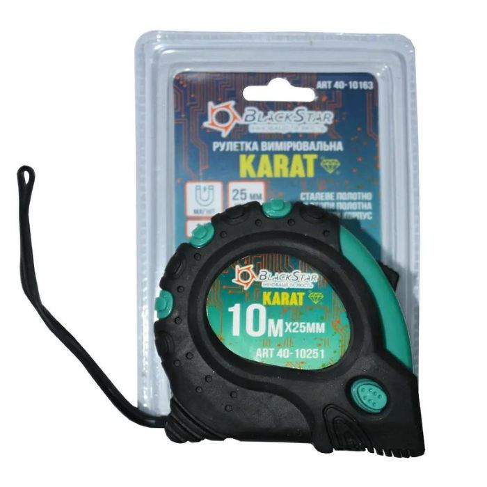 Рулетка 'Black Star' 10м*25мм КАРАТ идеально подходит для использования в строительстве, ремонте, внутренних и внешних работ. Благодаря своим характеристикам она обеспечивает точность и удобство при измерительных работах.