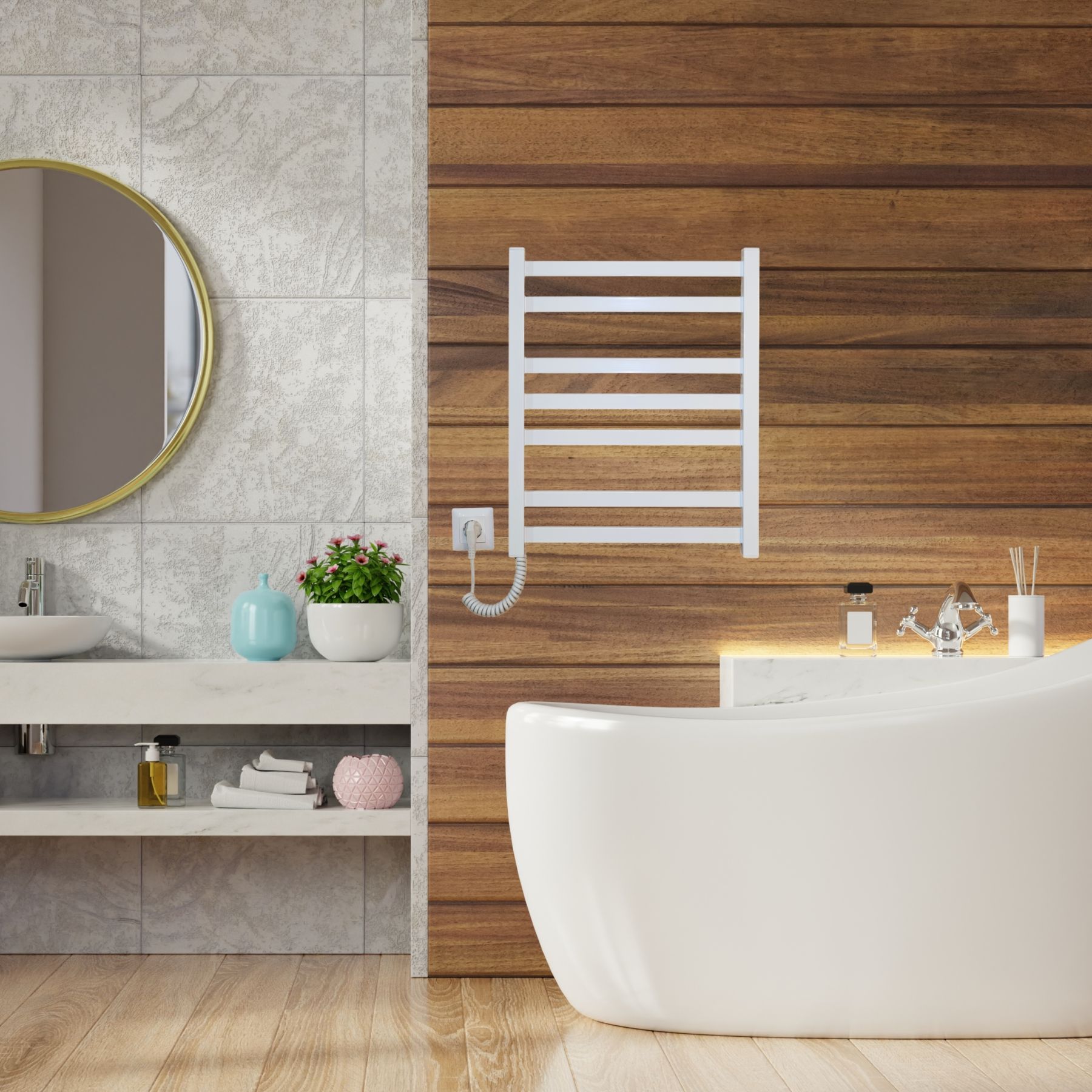 Модель оборудована двойным выводом питания, позволяющим подключать сушилку с любой стороны и комплектуется скрытым подключением для аккуратного монтажа. Конструкция состоит из 7 профильных ребер 30х10 мм и квадратных стоек 30х30 мм, образуя элегантный и гармоничный силуэт в итальянском стиле.