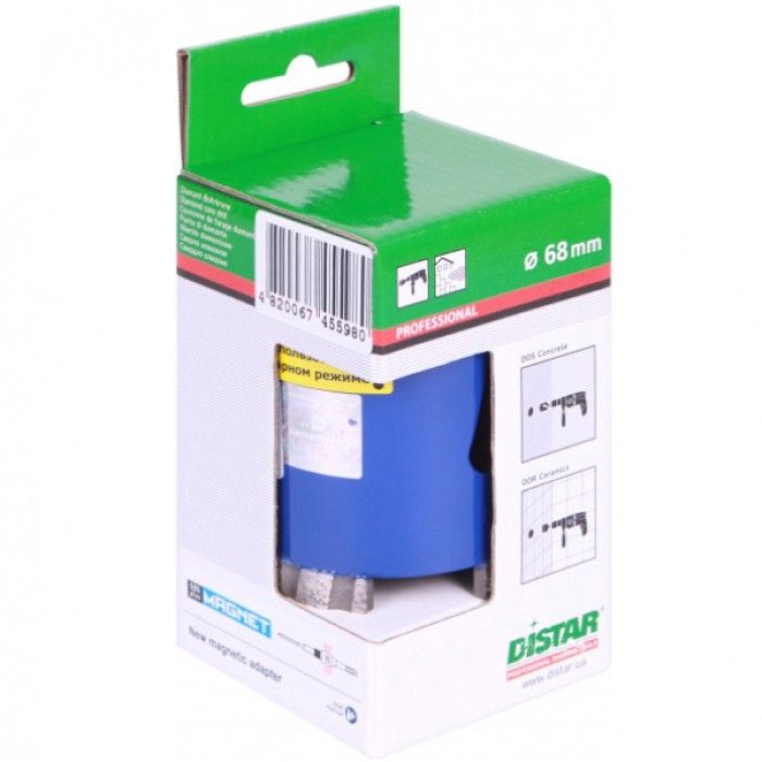 Алмазное корончатое сверло Distar САСС-W предназначено для сверления отверстий в бетоне диаметром 68 мм и глубиной до 65 мм. Это сверло имеет 4 крепежных отверстия под резьбу М16 и подходит для использования с SDS+ перфораторами. Оно идеально подходит для профессионального использования при работах на строительных площадках и ремонтных работах.