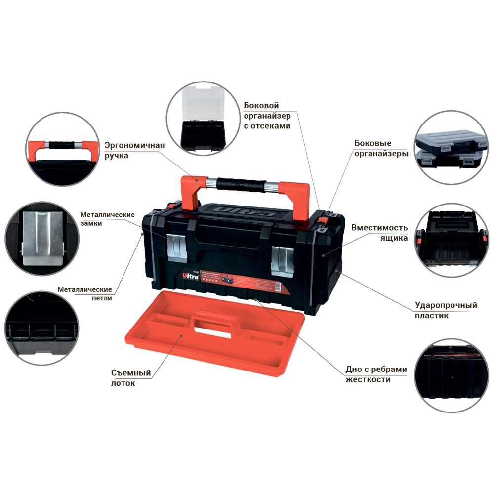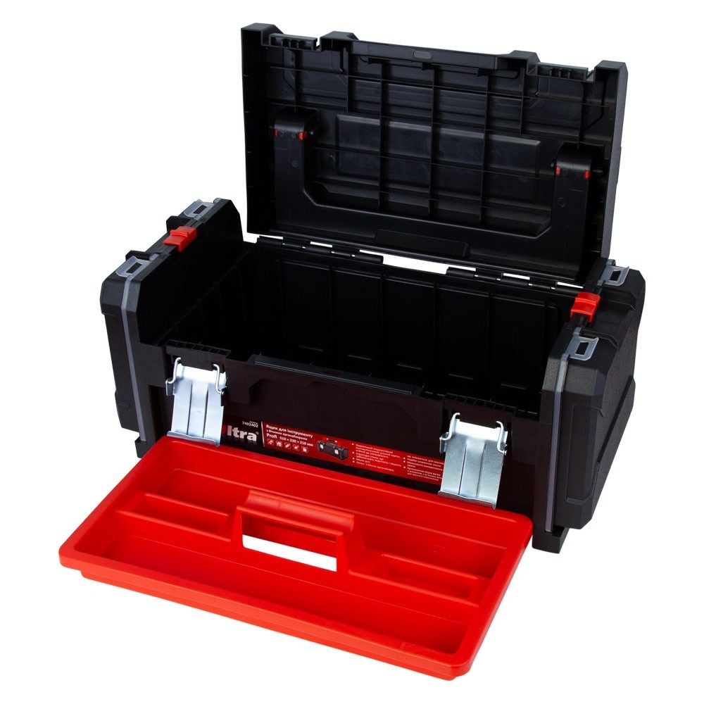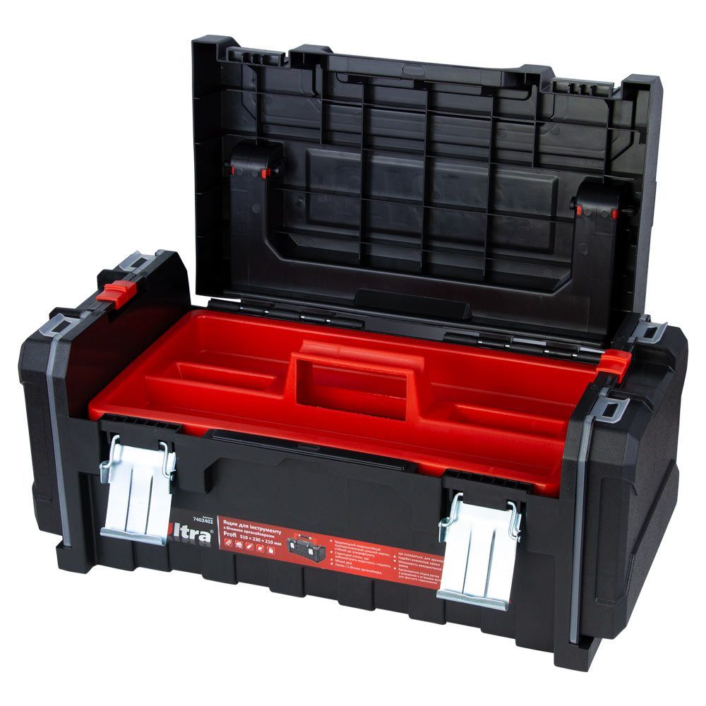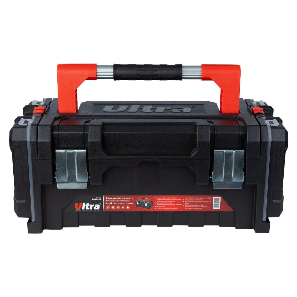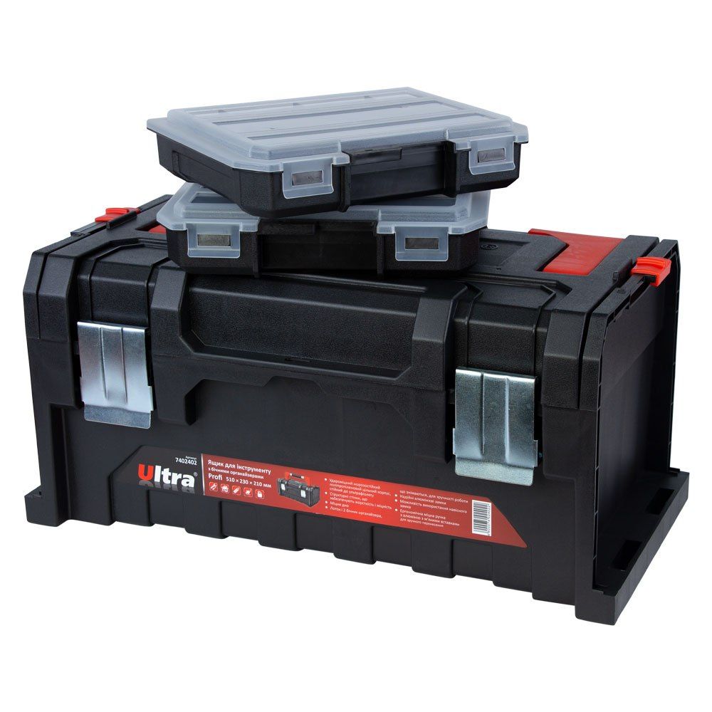 Ящик для инструмента ULTRA Profi 510×230×210 мм с боковыми органайзерами (7402402) предназначен для хранения, транспортировки и удобного доступа к ручному инструменту и мелким деталям. Благодаря нескольким секциям и органайзерам легко систематизировать крепеж, гайки, шайбы и другие элементы. Применяется как в быту, так и на производстве, мастерских, гаражах или СТО.