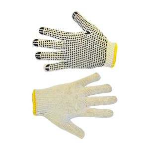 В'язані рукавички призначені для захисту рук під час складських, монтажних, побутових та садових робіт. Завдяки високому вмісту бавовни (65%), вони забезпечують комфорт і дозволяють шкірі дихати, запобігаючи потінню. Поліестер (35%) додає міцності, а ПВХ точкове покриття захищає від стирання. Манжета з гумкою надійно фіксує рукавичку, запобігаючи попаданню сміття, а оверлок перешкоджає розпусканню ниток. Рекомендовані для робіт середньої тяжкості. Рукавички мають 7 ниток у плетінні, клас в'язання — 10, розмір L.