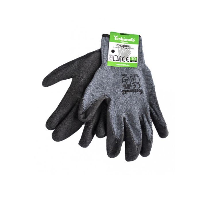 Рукавички Yoshimoto трикотажні з чорним латексним покриттям, які призначені для захисту та попередження ковзання під час будівельних, садових та господарських робіт.
