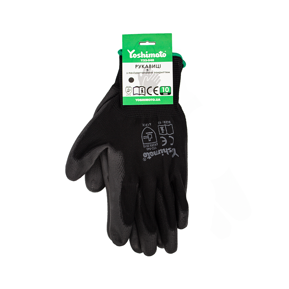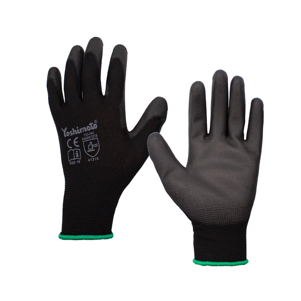 Рукавички Yoshimoto з чорним поліуретановим покриттям — це безшовні поліестерові вироби з ергономічним та легким дизайном, призначені для точних робіт, що потребують високої чутливості пальців.