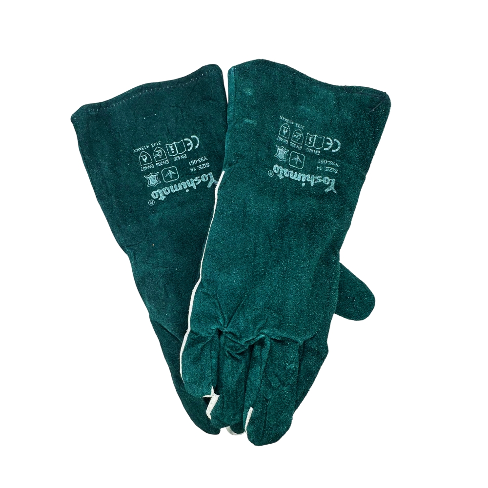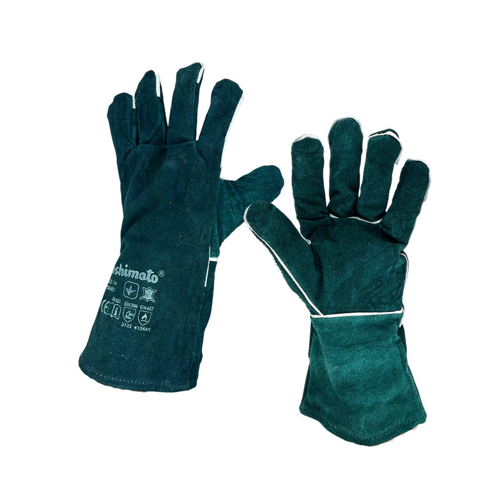 Характеристики: Бренд: Yoshimoto Тип: зварювальні рукавички матеріал: коров’яча замша (натуральна шкіра) Колір: темно-зелений Манжета: подовжена (крага) Розмір: 11 (XXL) Призначення: зварювання, робота з гарячими поверхнями, грубі монтажні роботи Захист від: порізів, механічних пошкоджень, іскор, жару Температурна стійкість: до короткочасного впливу високих температур