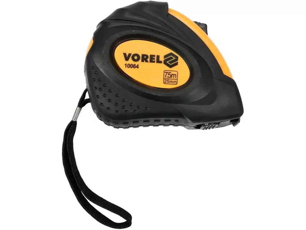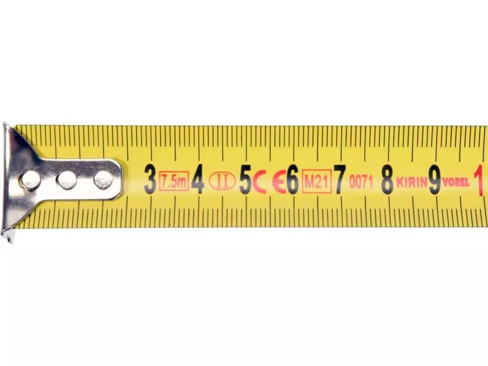 Рулетка VOREL довжиною 7,5 м і шириною полотна 25 мм — надійний вимірювальний інструмент для будівельних та побутових робіт. Оснащена двома фіксаторами, що забезпечують зручність у роботі та надійну фіксацію стрічки на потрібній довжині. Метрична шкала дозволяє швидко та точно знімати заміри. Корпус виготовлений із міцного матеріалу, який захищає від пошкоджень при інтенсивному використанні.