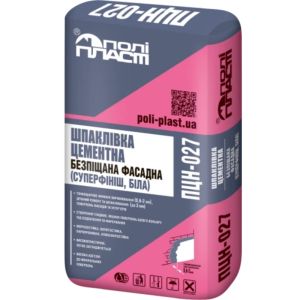 Поліпласт ПЦН-027 — цементна фінішна безпіщана шпаклівка, призначена для тонкошарового вирівнювання недеформованих мінеральних основ як всередині, так і зовні будівель. Підходить для цегли, легкого бетону, бетону, цементних та цементно-вапняних штукатурок. Суміш формує гладку білу поверхню, готову до фарбування або подальшого оздоблення.