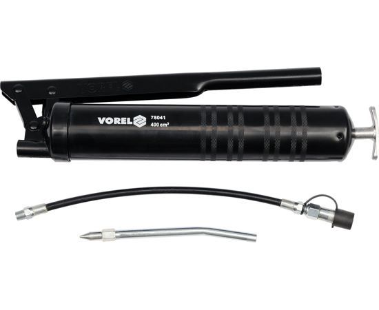 Шприц мастильний з гнучкою і жорсткою трубками VOREL з об'ємом 400 см3 та робочим тиском 41-69 МПа. Цей шприц призначений для використання з оливами та служить для змащення механізмів та збирання мастила. Виготовлений з металу, що забезпечує довгий термін експлуатації та надійність. Його об'єм складає 0,4 літра.