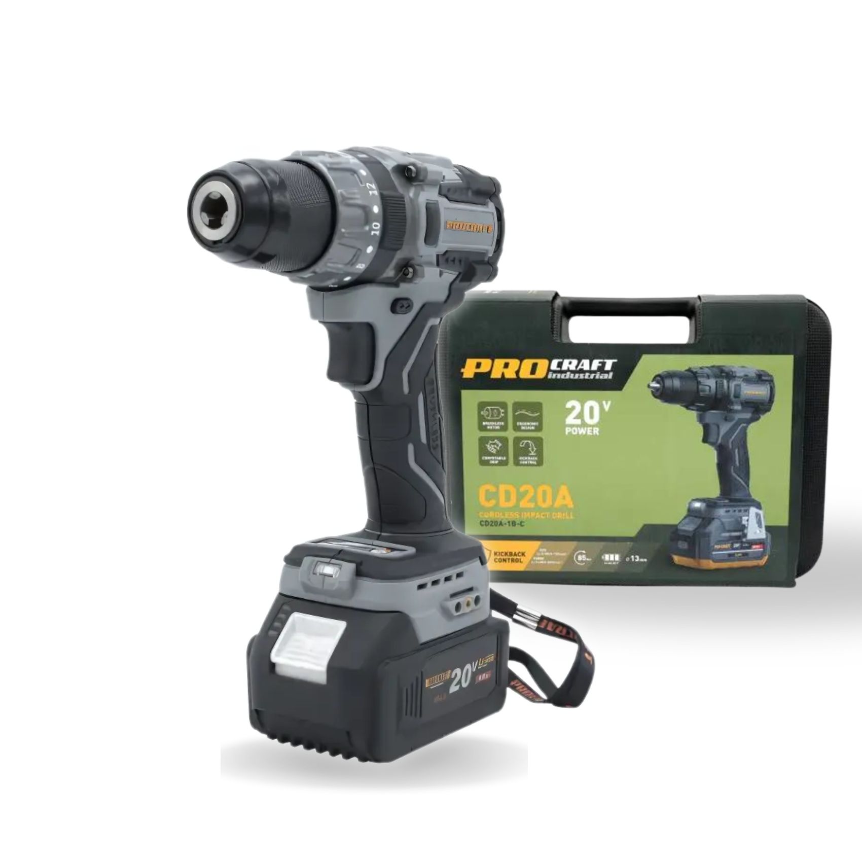 Шуруповерт Procraft industrial CD20A (з 1 акб та зп)Характеристики: Число оборотів холостого ходу: ECO: 0-380/0-1700 об/хв TURBO: 0-480/0-2000 об/хв Діаметр патрона: 13 мм Максимальний крутний момент6 85 Нм 3 режими: свердління, свердління + удар, затягування Плавний пуск: Є Тип двигуна: Безщітковий Рівень звукового тиску: LpA = 75 дБ (А); K = ± 3 дБ (А) Рівень звукової потужності: LwA = 80 дБ (А); K = ± 3 дБ (А) Рівень вібрації м / с2: 14,8 м/с2; K = ± 1.