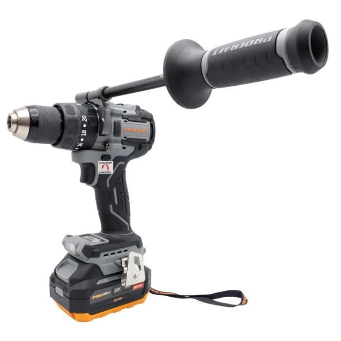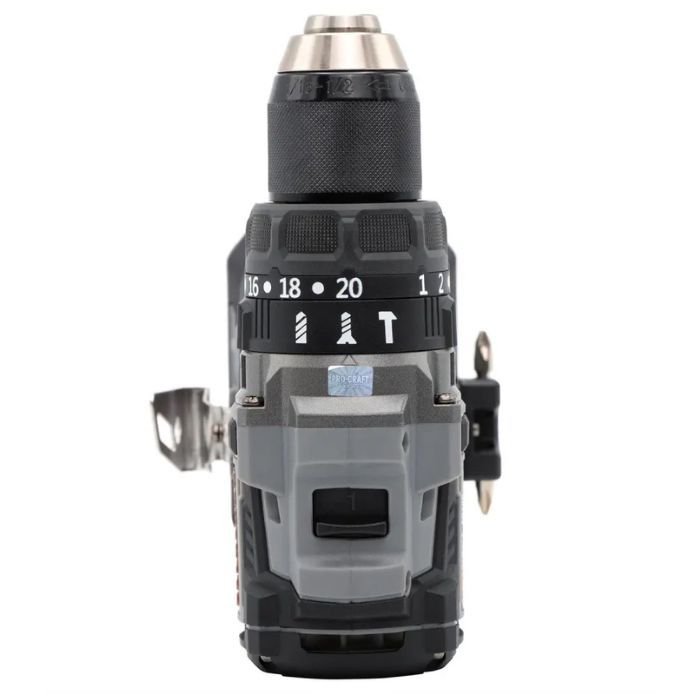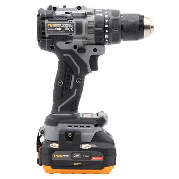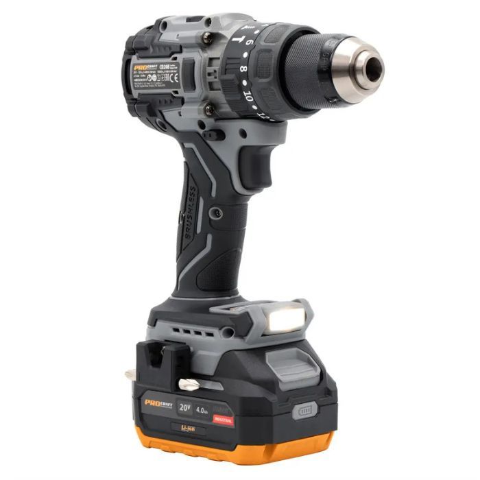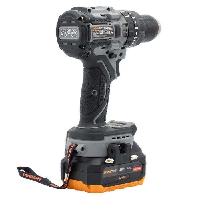 Шуруповерт Procraft industrial CD20B (з 1 акумулятором та зарядним пристроєм) і характеристики: Діаметр патрона: 13 мм Максимальний крутний момент: 150 Нм Режими роботи: 3 (свердління, свердління з ударом, затягування) Плавний пуск: Є Тип двигуна: Безщітковий Клас захисту: III Рівень звукового тиску: LpA = 81,2 дБ (А), K = ± 5 дБ (А) Рівень звукової потужності: LwA = 89,2 дБ (А), K = ± 5 дБ (А) Рівень вібрації: 11,738 м/с, K = ± 1,5 м/с Рівень захисту: IP20 Напруга акумулятора: 20 В Ступінь обертального моменту: 20 Kick back control: Є Імпульсний режим: Є