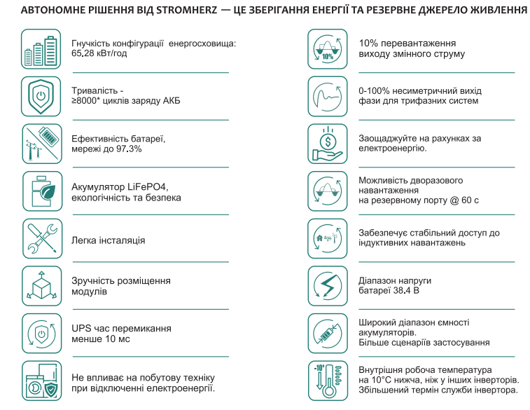 Stromherz – компанія є одним із небагатьох виробників, які інвестують у фундаментальні дослідження пристроїв на сонячних батареях. Виробник пристроїв TM Stromherz, заснований у 1993 році командою досвідчених інженерів-фахівців у Вельсі, Австрія, спеціалізується на фундаментальних дослідженнях технології акумуляторів LFP (літій-залізо-фосфат) та на розробці ESS (систем зберігання енергії). Акумулятори LFP (літій-залізо-фосфатні акумулятори) відомі терміном служби понад 10 000 циклів при глибині розряду 90% та гарантією якості 10 років. Офіційний сайт виробника Stromherz. Комерційна система акумулювання енергії S-50K-3Р-40А-ESS-UA 65,28 кВт від провідного австрійського виробника Stromherz це інтелектуальні гібридні системи збереження енергії великих об’ємів, які перетворюють енергію сонця в акумулятори на цілодобовий ресурс, одночасно пропонуючи резервне живлення у разі збою в електромережі. Stromherz зберігає, знижує витрати на енергію, покращує стійкість мережі. Сонячна гібридна комерційна станція Stromherz S-50K-3Р-40А-ESS-UA 65,28 кВт — це ідеальне рішення для сільського господарства, високотехнологічного виробництва, комерційних зарядних станцій, великих домогосподарств. Комплектація: Інвертор гібрідний комерційний Stromherz S-50K-3Р-40; BMS Stromherz SС-1000V-3,84kWh; АКБ Stromherz SС-24-3.84kWh * 17 шт, загальна ємність АКБ 65,28 кВт, кабінет Stromherz SС 17 Характеристики Інвертора:
