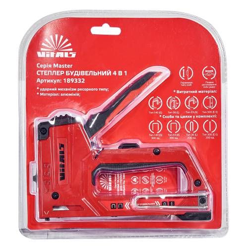Степлер будівельний ресорний 4 в 1 Vitals Master має ще кілька унікальних властивостей: можливість регулювання сили закріплення; наявність блокування для безпеки при транспортуванні; зручну рукоятку, що забезпечує комфортне використання; універсальний різець, який дозволяє легко змінювати матеріали.