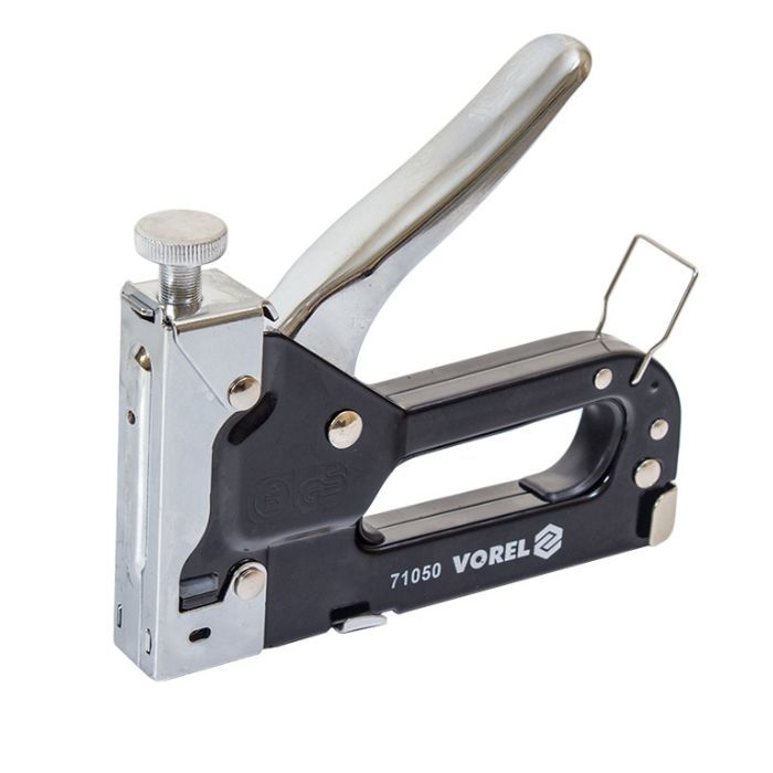 Степлер VOREL металевий із регулюванням — це надійний інструмент, призначений для кріплення матеріалів до поверхонь із дерева, ДВП, гіпсокартону та пластику.