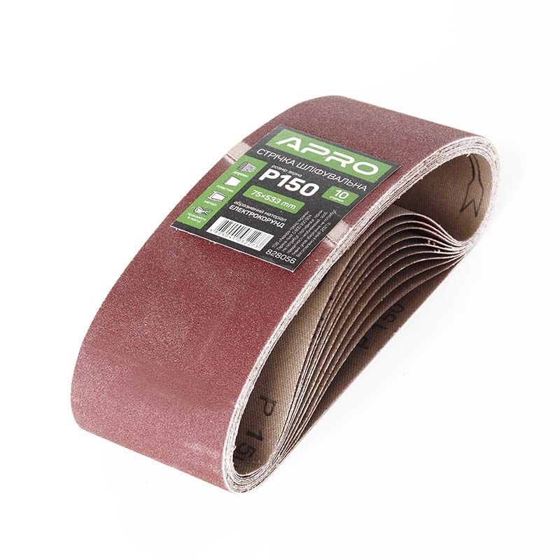 Основні переваги стрічки шліфувальної нескінченної 75*533 мм Р150 (10шт.) (APRO): висока якість шліфування, довговічність, надійність, можливість використовувати на різних матеріалах, комфортна робота завдяки зручним розмірам і безшумність.