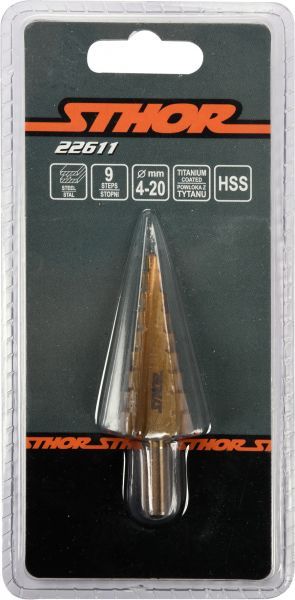 Свердло конічне ступінчасте по металу STHOR: HSS 4241, =4-20мм ідеально підходить для використання у будівельній галузі, механічній обробці та виробництві металевих конструкцій. Воно може бути використано для свердління отворів у металевих пластинах, трубах, профілях та інших виробах з металу. Воно також підходить для свердління на виробничій лінії, де швидкість та точність є важливими критеріями. Завдяки своєму універсальному діапазону діаметрів, свердло може бути використано для різних проектів та завдань з обробки металу.