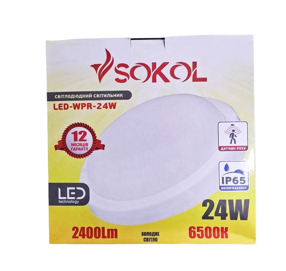 Світильник LED вологозахищений з датчиком руху SOKOL 24Вт, 220В, 2400лм, 6500K, IP65, круглий (ЖКГ) Технічні характеристики: Тип: Світлодіодний (вбудовані LED-чіпи) Потужність: 24 Вт Світловий потік: ~2400 лм (еквівалент лампи розжарювання 180–200 Вт) Напруга: 220-240 В Колірна температура: 6500K (холодне біле світло) Форма: Коло Ступінь захисту: IP65 (повна герметичність: захист від пилу та води) Датчик руху: Вбудований ІЧ-датчик (інфрачервоний), автоматичне вмикання при русі матеріал корпусу: Міцний термостійкий пластик з матовим розсіювачем Діаметр: Зазвичай 250–280 мм Монтаж: Накладний, на стіну або стелю Переваги: Висока яскравість — 2400 люменів для якісного освітлення великих площ Енергозбереження — працює тільки при наявності руху Безпечний і довговічний — не нагрівається, працює до 30 000 годин Захист IP65 — можна встановлювати у вологих або запилених місцях Антивандальний корпус — стійкий до механічних пошкоджень Широкий кут розсіювання — рівномірне освітлення без тіней Сфера застосування: Сходові клітки, під'їзди Підвали, комори, технічні приміщення Вуличні коридори, навіси, входи в будівлі Склади, гаражі, приміщення ЖКГ
