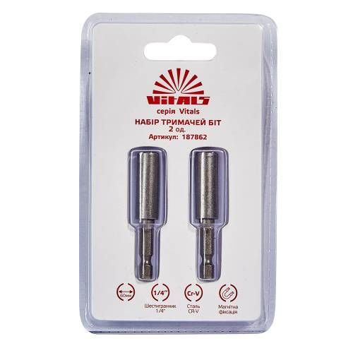 Тримач для біт магнітний 1/4"х60 мм, 2 од. Vitals - це інструмент, який стане незамінним помічником для виконання будь-яких робіт з розвинчування та завинчування. Довжина тримача складає 60 мм, що робить його зручним для роботи в складних та вузьких місцях. Виготовлений зі сталі Cr-V, він є міцним, надійним та довговічним інструментом.