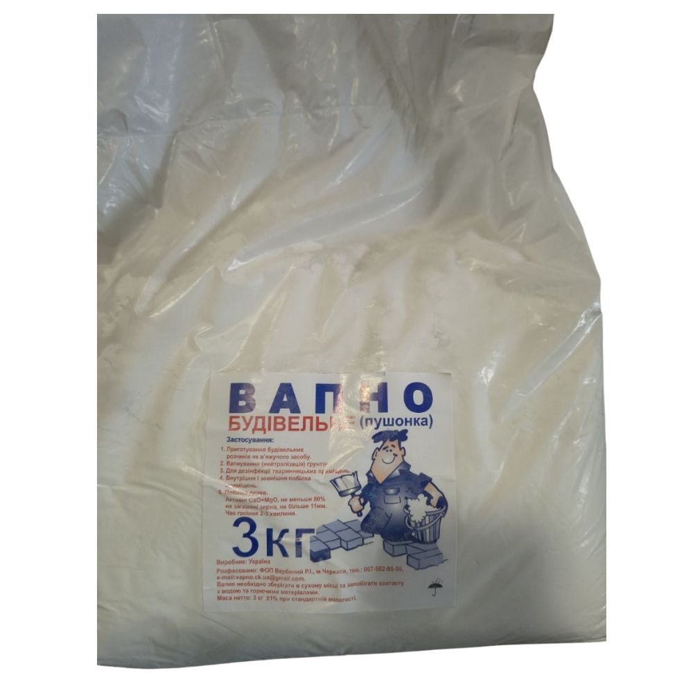 Вапно-пушонка 3 кг (1 сорт) — якісний будівельний матеріал на основі гашеного вапна, що використовується для приготування розчинів, побілки та дезінфекційних робіт.