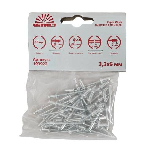 Заклепки алюмінієві 3.2x6 мм (50 од.) Vitals мають ще кілька унікальних властивостей:- Алюмінієвий матеріал не піддається корозії- Можуть використовуватися для різних типів поверхонь і матеріалів- Економічний варіант кріплення- Легко замінюються