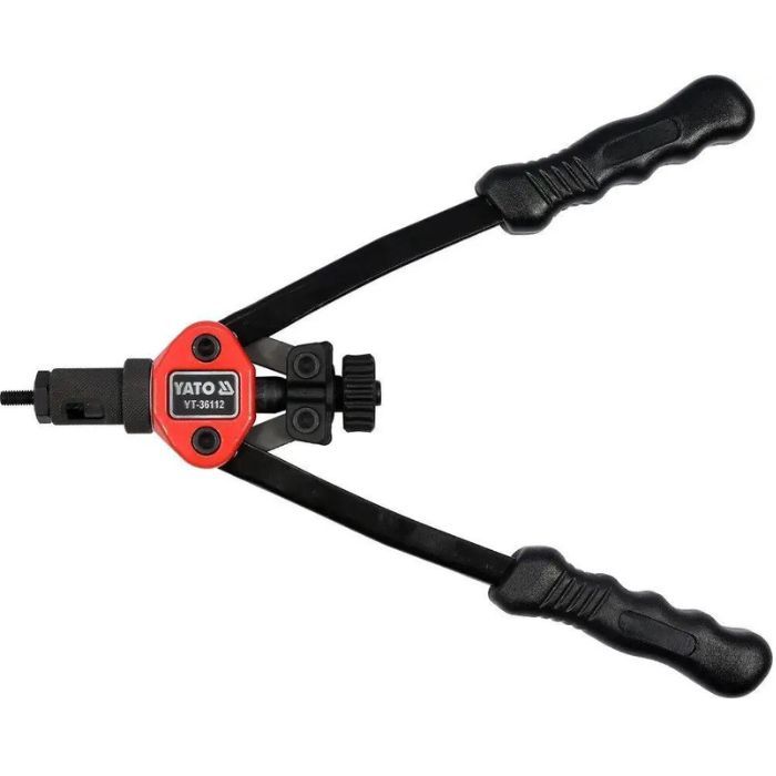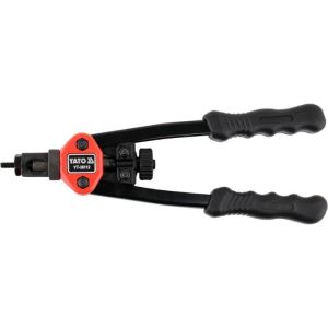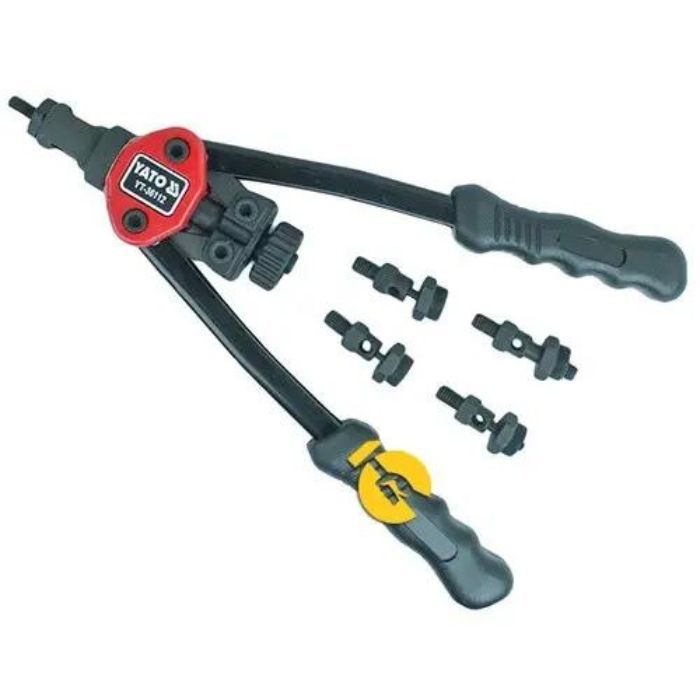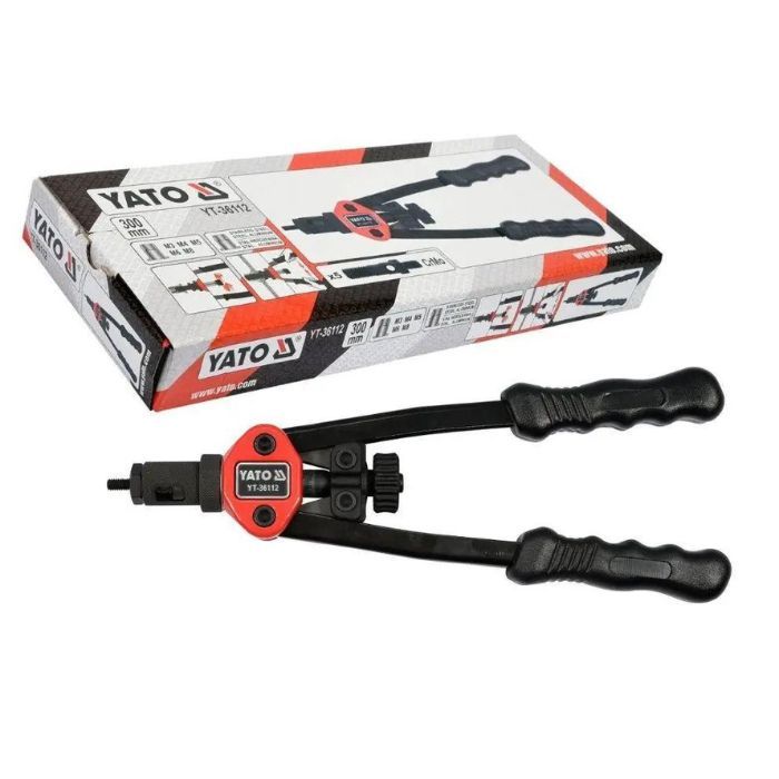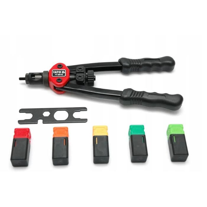 Заклепник нарізний дворучний ідеально підходить для надійного з'єднання кількох деталей за допомогою металевих нарізних заклепок різних розмірів: М3, М4, М5, М6, М8. Конструкція виготовлена зі сталі CrMo, що забезпечує міцність і довговічність інструменту. Завдяки зручним гумовим ручкам, процес роботи стає комфортним і безпечним. У комплект входять 5 змінних головок для заклепок із різзю (M3, M4, M5, M6, М8), що робить інструмент універсальним для різних видів з'єднань. Довжина інструменту становить 300 мм, а його вага – 0,171 кг, що забезпечує легкість у користуванні.