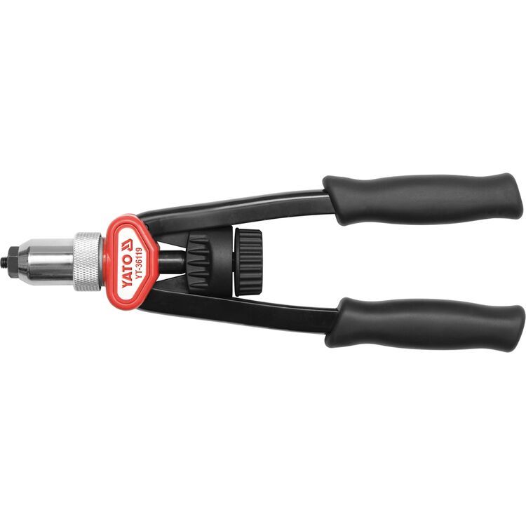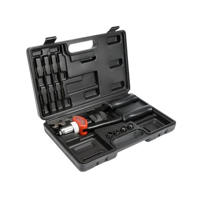 Заклепочник для різьбових заклепок призначений для виконання кріпильних робіт, що забезпечують надійне з'єднання матеріалів за допомогою різьбових заклепок діаметрами M5, M6, M8, M10, M12. Виготовлений із міцної хром-ванадієвої сталі, він відмінно підходить для з'єднання тонколистових матеріалів, забезпечуючи їх міцну фіксацію. Завдяки продуманій конструкції пістолет забезпечує швидке та легке виконання завдань. Металева ручка з гумовими накладками робить роботу комфортнішою. У комплект входять кейс і 5 різьбових заклепок. Довжина інструмента – 338 мм, вага – 2 кг.