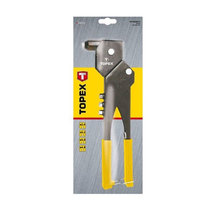 Заклепувальний пістолет Topex 43E713 призначений для роботи з алюмінієвими заклепками діаметром від 2,4 до 4,8 мм.