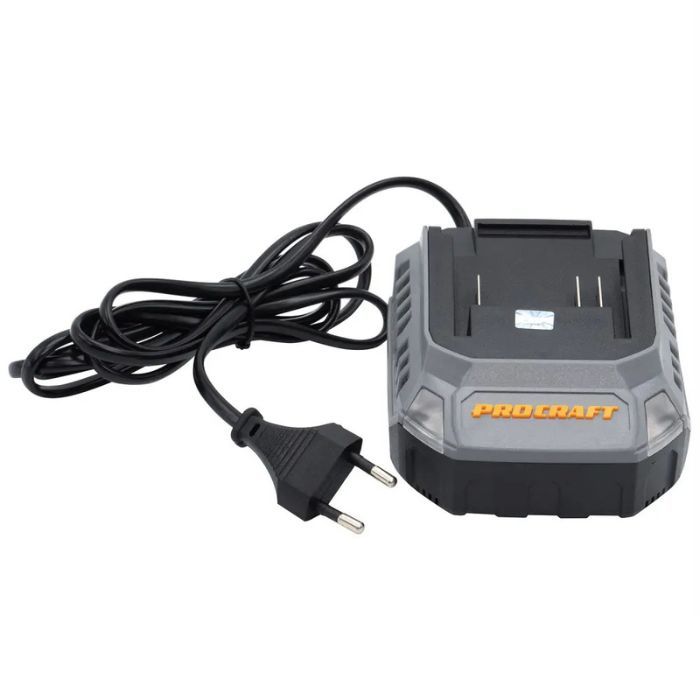 Технічні характеристики: Модель: Procraft Industrial C20/2 Тип: зарядний пристрій для акумуляторів Вхідна напруга: 220–240 В Частота струму: 50 Гц Вихідна напруга (зарядки): 20 В Сила струму: 2 А Сумісність: акумулятори Procraft 20 В (Li-Ion) Захист від перегріву та короткого замикання: є Індикація стану заряду: LED