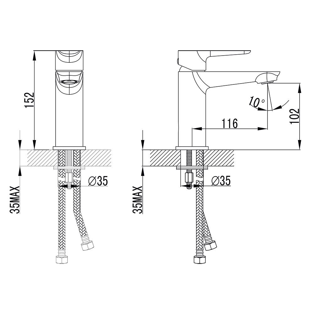 Монтаж: У комплекті є надійна кріпильна шпилька з нержавіючої сталі та два гнучкі шланги з нержавіючої сталі розміром 1/2" x M10 x 400 мм для підключення до водопроводу.