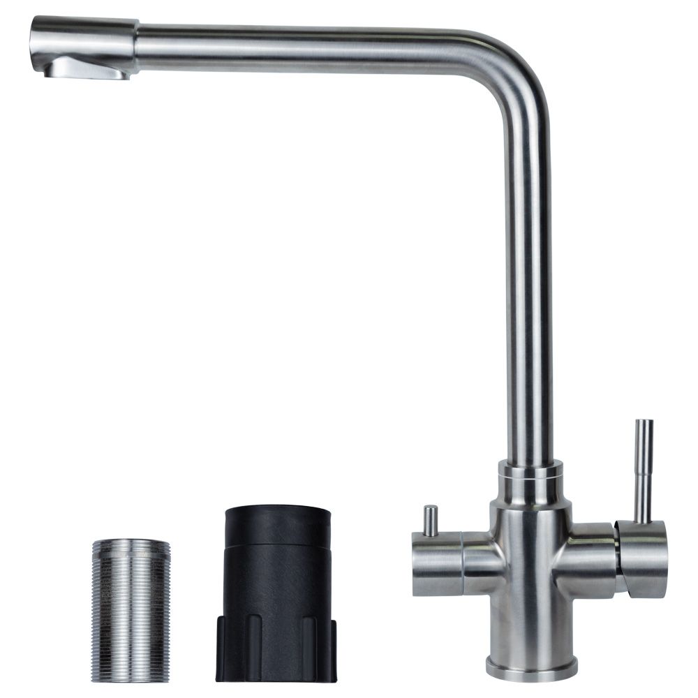 Характеристики: Тип монтажу: врізний Керування: одноважільне Вилив: поворотний, довжина 24 см Висота змішувача: 24 см Картридж: керамічний 35 мм матеріал: нержавіюча сталь Колір: нержавіюча сталь Додаткові функції: Підключення до фільтра для питної води (фільтр у комплект не входить) Додатковий вентиль для відфільтрованої води Бічне розташування важеля Тип кріплення: гайка Комплектація: гнучкі шланги підключення " Вага: 1,8 кг