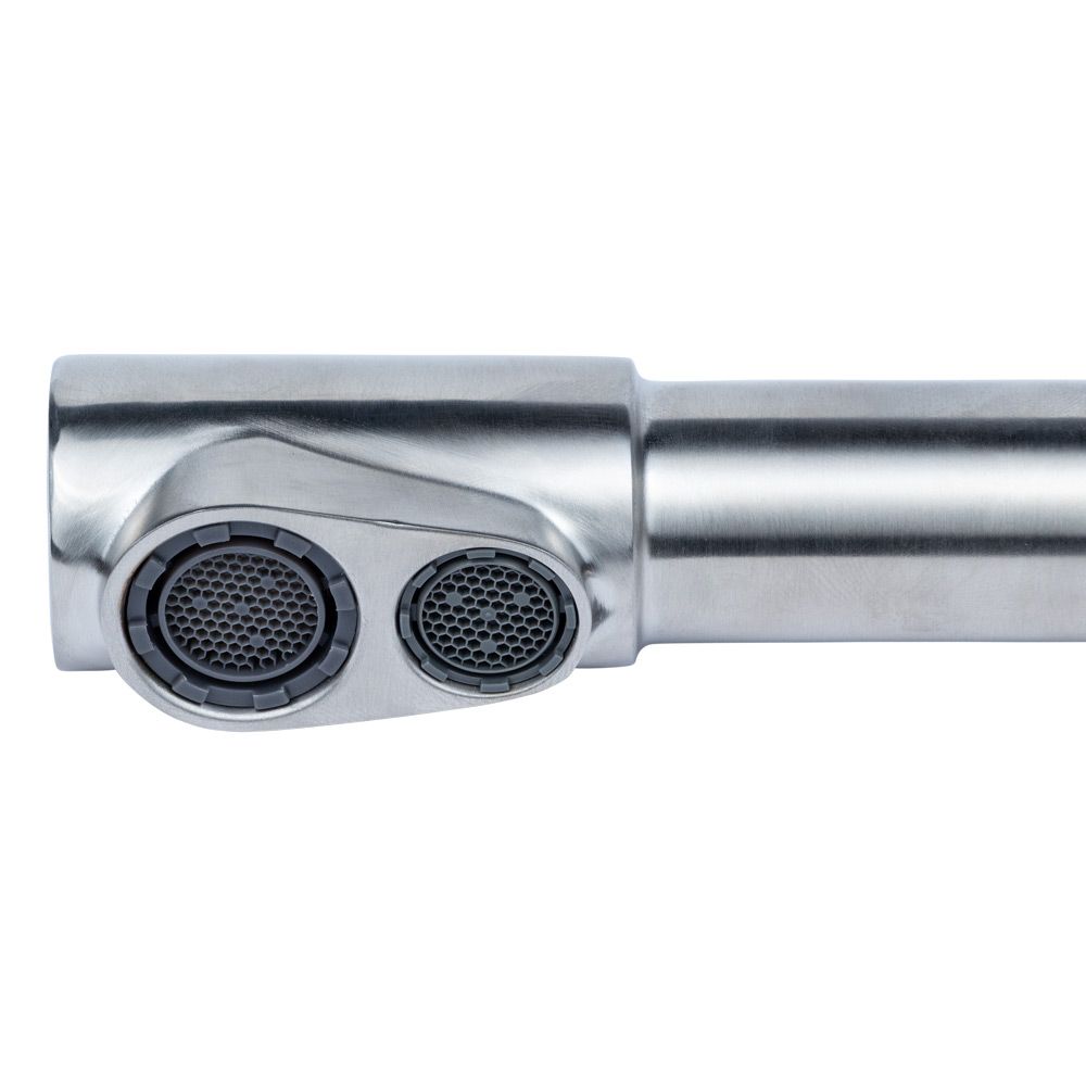 Виконаний у кольорі нержавіючої сталі, оснащений поворотним виливом довжиною 24 см та додатковим вентилем для подачі відфільтрованої води.