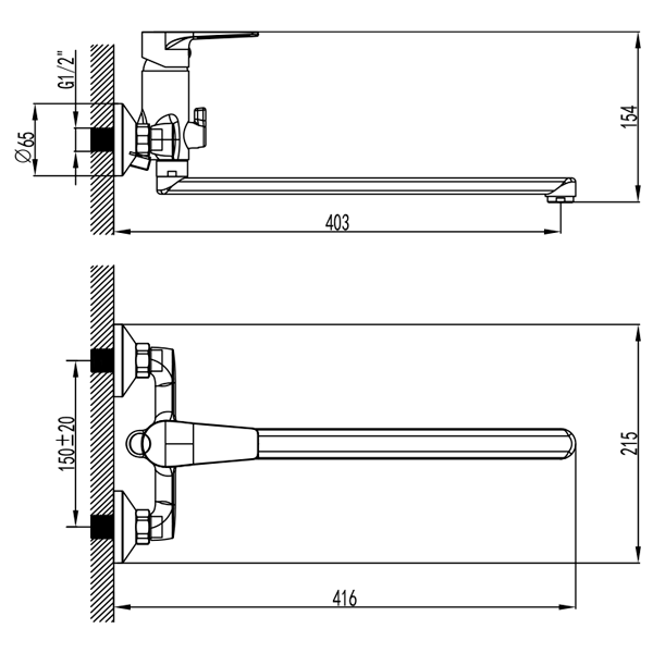 Довгий поворотний вилив 350 мм — підходить для ванни та миття без умивальника.