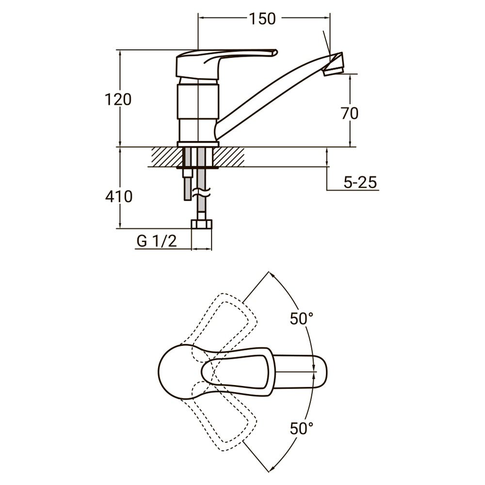 Основні характеристики: Тип: одноважільний кухонний змішувач матеріал корпусу: латунь Покриття: хромонікель Картридж: керамічний, 40 мм Вилив: прямий, 150 мм, з обертанням 360° Кріплення: фіксація шпилькою Монтаж: на горизонтальну поверхню Тиск води: від 0.