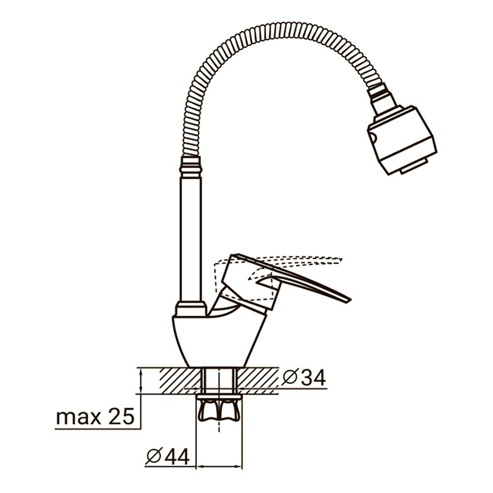 Основні характеристики: Тип змішувача: одноважільний Картридж: керамічний 40 мм — надійний, довговічний, стійкий до зношування Вилив: гофрований, гнучкий — змінює положення для зручності використання Кріплення: гайка (корона) Покриття: хромонікелеве матеріал корпусу: сплав на базі міді, цинку та алюмінію Комплектація: 2 шланги підведення " M10 400 мм Гарантія: 36 місяцівРобочі параметри: Мінімальний тиск: 0.
