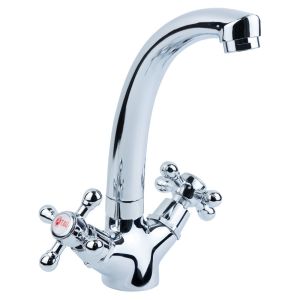 Двохвентильний змішувач для кухні з обертовим виливом на шпильці. Має зручне керування окремими вентилями для гарячої та холодної води, а також класичний дизайн, що підходить для більшості кухонь. Оснащений аератором для стабілізації потоку води та економії її споживання.
