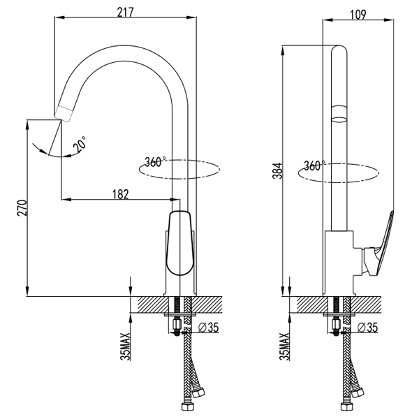 Одноважільний кухонний змішувач з поворотним виливом 360° і керамічним картриджем 35мм.