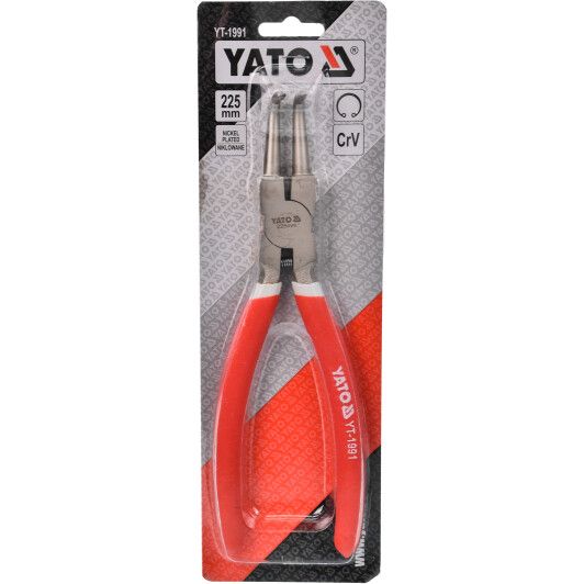 Знімач зігнутий на стискання YATO YT-1991 довжиною 225 мм призначений для встановлення та зняття внутрішніх стопорних кілець. Виготовлений із міцної хром-ванадієвої сталі, що забезпечує довговічність та надійність у роботі. Оснащений зручною пластиковою ручкою для комфортного утримання. Кінцівка інструмента має нікелеве покриття, що підвищує стійкість до корозії.